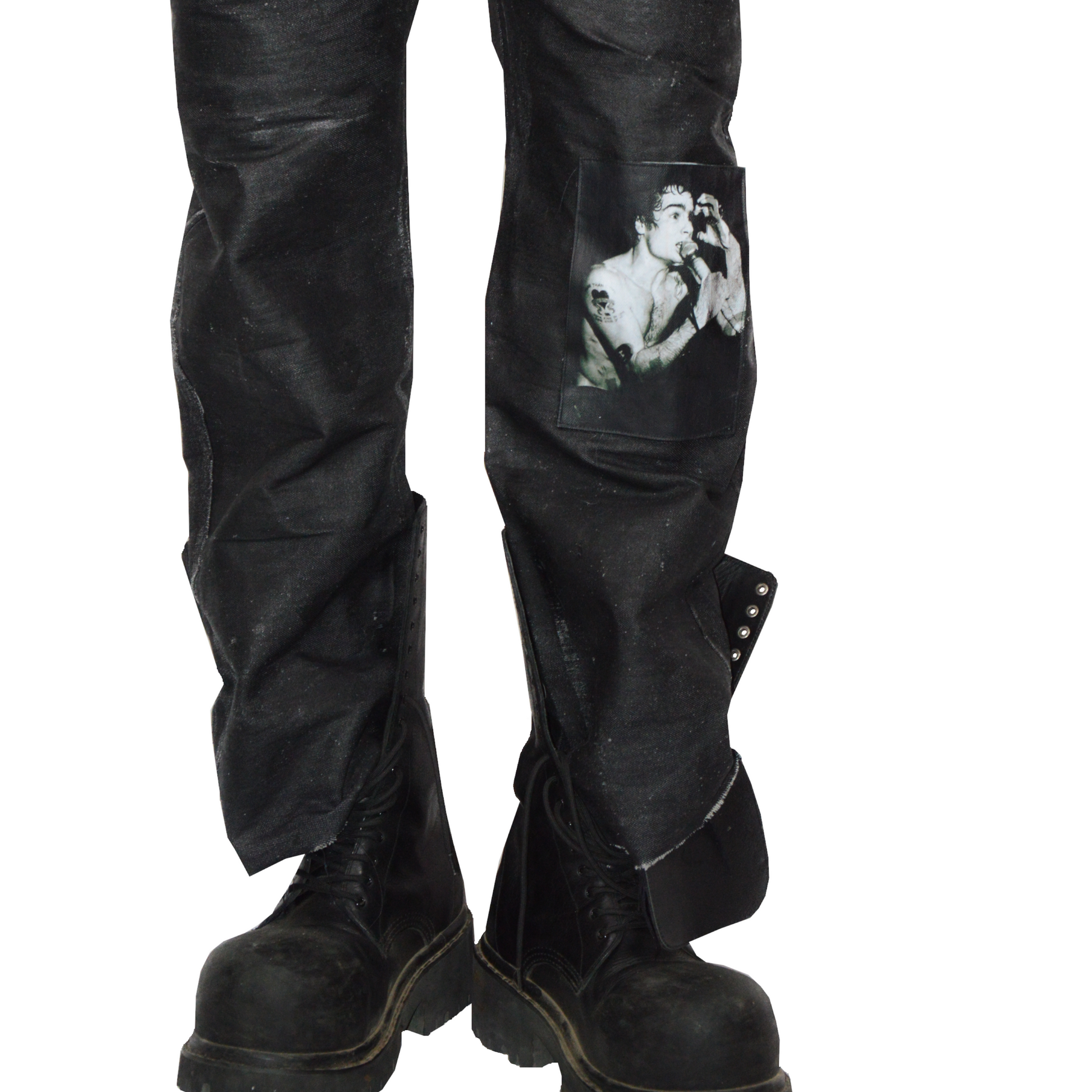 Hand-Painted And Waxed Raw Denim Jeans With Vinyl Print Patch.